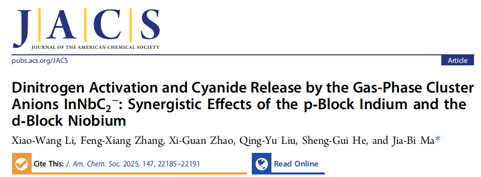 近日,kaiyun开云官方马嘉璧课题组在气相团簇化学领域取得重要进展,相关研究成果以“Dinitrogen Activation and Cyanide Release by the Gas-Phase Cluster Anions InNbC2–: Synergistic Effects of the p-Block Indium and the d-Block Niobium”为题在国际顶级期刊《J. Am. Chem. Soc》发表。