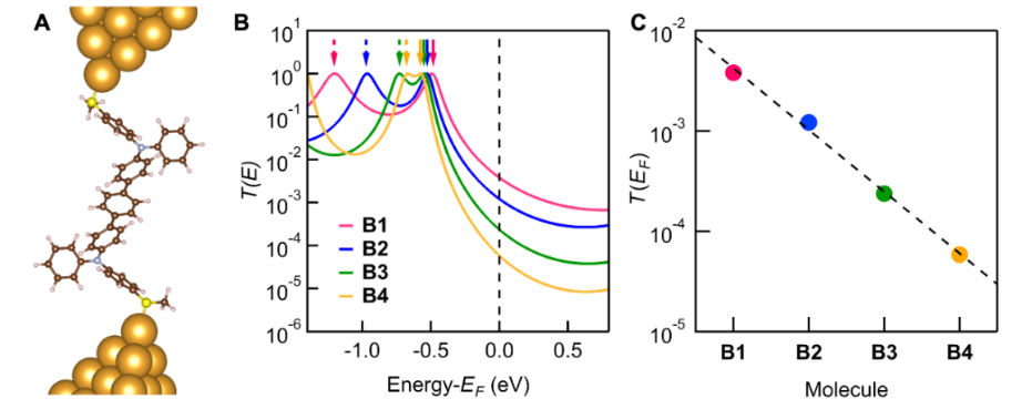 kaiyun开云官方的尹晓东特别研究员一直以来对于具有氧化还原活性的有机分子在单分子电子学上的性质和应用有着浓厚的兴趣。在美国进行博士后研究期间就与美国哥伦比亚大学 (Columbia University) 的Latha Venkataraman教授和Luis M. Campos教授合作发表关于氧化还原调控分子芳香性从而导致电导大幅增加的研究成果 (Science Advances, 2017, 3: eaao2615)。而在本工作中,尹晓东特别研究员与Venkataraman教授,Luis M. Campos教授以及德国雷根斯堡大学 (University of Regensburg) Ferdinand Evers教授等人开展合作,系统研究了一系列含有低聚苯桥的双(三芳基胺)分子导线在电中性,一价和二价阳离子状态的单分子电学性质。相关工作于近期发表在化学类国际顶级期刊Nature Chemistry上 (Nat. Chem. 2022,10.1038/s41557-022-00978-1)。
