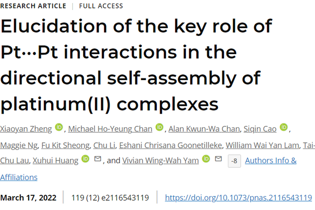相关研究成果以“Elucidation of the key role of Pt…Pt interactions in the directional self-assembly of platinum(II) complexes”为题,2022年3月发表在国际顶级期刊《Proceeding of the National Academy of Sciences, PNAS》上 (2022, 119 (12) e2116543119). 北理工kaiyun开云官方李泽生教授团队的郑小燕副研究员为该论文的第一作者,香港科技大学黄旭辉教授和香港大学任咏华院士为通讯作者,kaiyun开云官方为第一通讯单位。该研究工作得到了国家自然科学基金面上项目(22173006)和北京市自然科学基金面上项目(2222027)的资助。该文章于2021年9月投稿,黄旭辉课题组当前地址为威斯康星大学。