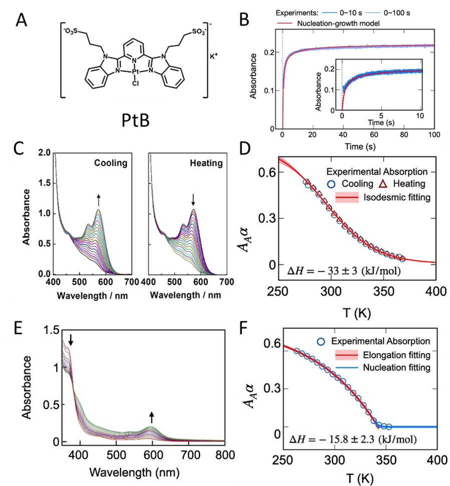 kaiyun开云官方李泽生教授团队的郑小燕副研究员、香港科技大学的黄旭辉教授和香港大学的任咏华院士合作对不同溶剂环境下两亲性Pt(II)配合物PtB的分子组装机制进行了系统的研究。由于分子间Pt···Pt相互作用会产生新的光谱信号,通过变温紫外可见光谱可获取平衡态PtB的组装体相对于单体的比例(α)随温度的变化,作者分别通过等键模型(Isodesmic model)和成核增长模型(Nucleation-Elongation model)拟合不同溶剂下PtB的α-T曲线来探索其分子组装体生长机制。研究发现:在纯水溶液中,α-T曲线符合等键增长模型,所得平衡常数分别为Ke300K = 2.4×103 M-1和Ke368K = 2.6×102 M-1;在丙酮和水混合溶液中,α-T曲线符合成核增长模型,所得平衡常数为Ke298K = 2.6×103 M-1和Ke328K = 1.4×102 M-1。同时成核过程对应的平衡常数为5.0×10-6。此外,作者通过Stopped-flow吸收光谱实验测定了PtB在丙酮和水混合溶液中的组装过程动力学。结果发现,实验数据符合成核增长模型:在t=0.1s时,PtB具有1.1×10-6 M s-1的成核速率,随后成核速率急剧下降直至1.0 s时几乎可忽略不计。在t=0.1s时,PtB的生长速率为10.6 s-1,随着PtB单体被消耗和分子组装体间的融合,其生长速率逐渐降低。这一结果表明PtB在丙酮和水混合物溶液中的组装过程符合成核增长形成机制。