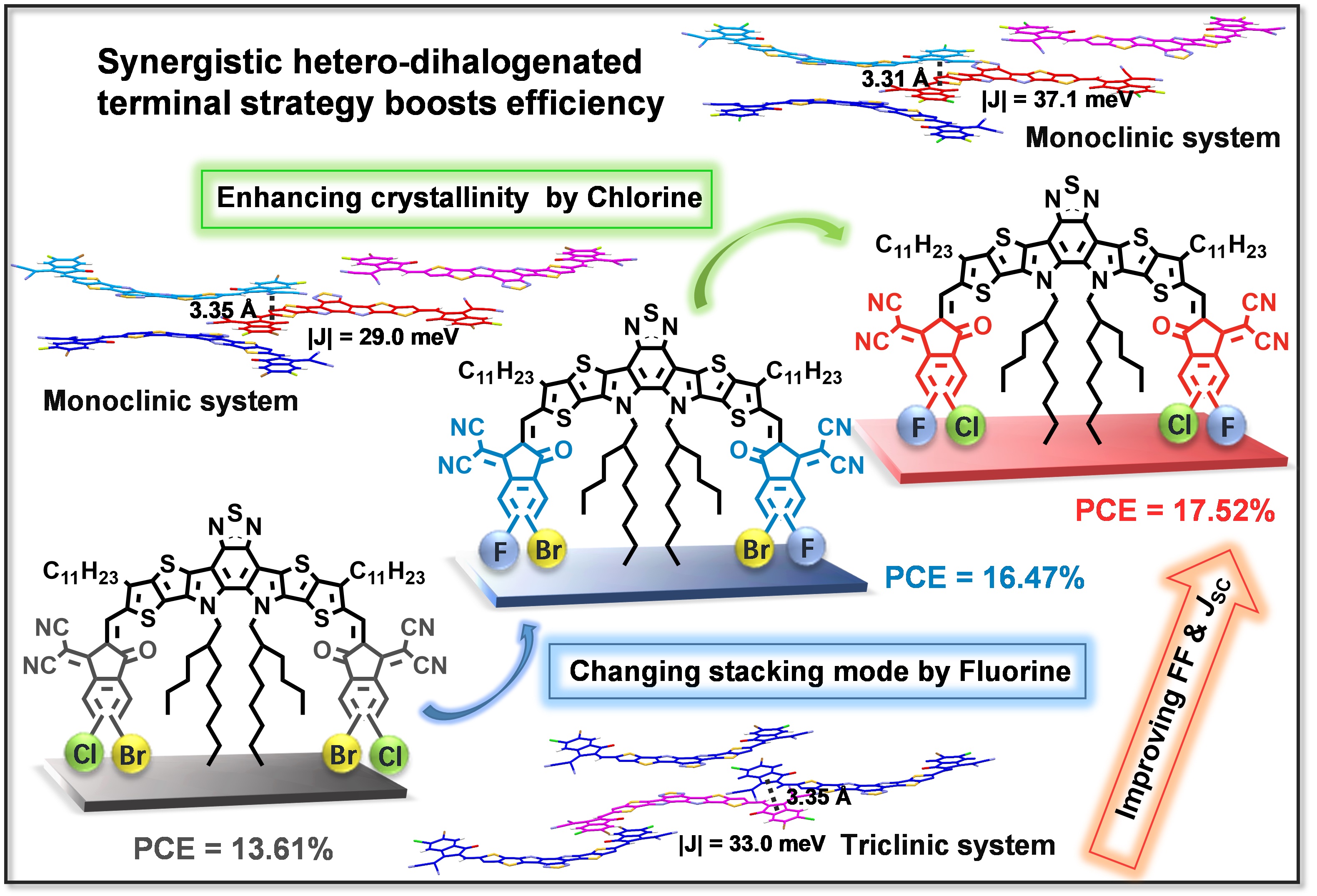 图3: 三种异双卤化端基所修饰的受体分子材料的分子结构、晶体堆积差异和太阳能电池性能之间构效关系图