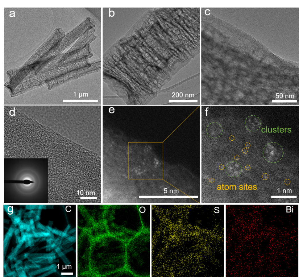 过氧化氢(H2O2)作为一种环保型氧化剂,广泛应用于化工、医疗、环境修复等领域。传统工业中常用的蒽醌法生产H2O2不但能源消耗量大,而且严重依赖钯等贵金属催化剂。相比之下,没有任何毒害副产物的电催化双电子氧还原反应(2e- ORR)被认为是绿色合成H2O2的理想途径,但该过程缓慢的动力学特性需要高性能催化剂来驱动。虽然贵金属基催化剂在2e- ORR中表现出色,但稀缺性和高成本阻碍了其进一步应用。此前,由d区非贵重过渡金属(如Fe、Co和Ni)构建的单原子催化剂已不乏报道,它们凭借最大的原子利用率和可调节的电子结构,对电催化ORR表现出优异活性。而对于p区金属原子,如Bi,考虑到其独特的d10电子构型,其活性的调制面临很大的挑战。
