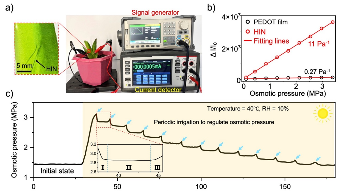 通过设计分级非均质结构实现了离子-电子转导的“双重加速”:既实现了电子主导的快速电荷传输行为,又能将界面的离子信号即时高效的“翻译”。这种“双重加速”让HIN凝胶能实时读懂植物的“口渴信号”。将HIN水凝胶作为的微型电极植入植物叶片后,其能以超高灵敏度实时捕捉植物内部的渗透压变化。