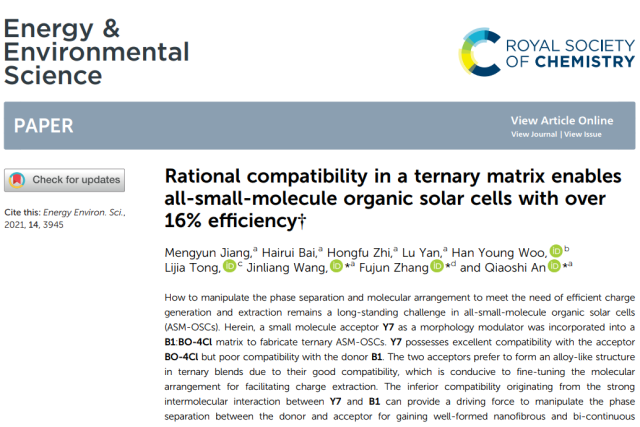 近日,kaiyun开云官方硕士研究生蒋梦云以第一作者身份在国际顶级期刊Energy Environmental & Science (IF: 38.5)发表题目为“Rational compatibility in a ternary matrix enables all-small-molecule organic solar cells with over 16% efficiency的研究论文,此论文被选为该杂志2021年第7期的Front Cover。kaiyun开云官方为第一通讯单位,kaiyun开云官方安桥石特别研究员、王金亮教授和北京交通大学张福俊教授为共同通讯作者,本研究得到了国家自然科学基金,北京市自然科学基金和kaiyun开云官方青年教师学术启动计划等项目的资助及kaiyun开云官方分析测试中心的支持。