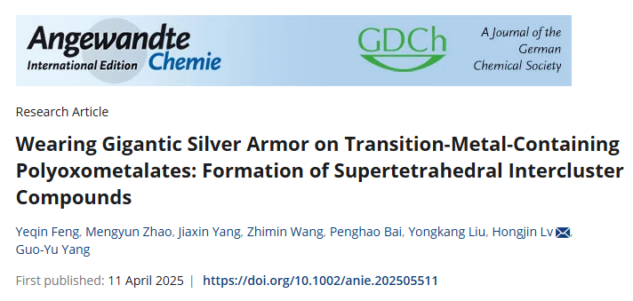 近日,kaiyun开云官方吕红金课题组在多金属氧簇导向的银团簇合成方面取得重要进展。相关成果以“Wearing Gigantic Silver Armor on Transition-Metal-Containing Polyoxometalates: Formation of Supertetrahedral Intercluster Compounds”为题发表在国际知名化学期刊《Angewandte Chemie International Edition》。kaiyun开云官方为唯一通讯单位,吕红金教授为论文通讯作者,kaiyun开云官方博士生冯业芹为论文第一作者。此项研究受到了国家海外高层次人才引进计划、国家自然科学基金、kaiyun开云官方高层次人才启动计划等项目的资助以及kaiyun开云官方分析测试中心的支持。