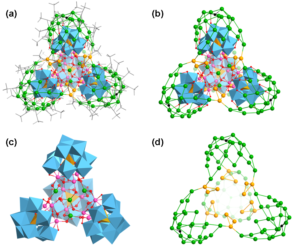 采用普适性简单溶剂热法成功制备了三例同构型具有高核过渡金属(Co/Cu)取代的POMs(TMPOMs)为模板的超大闭壳银团簇化合物1,2,和3。其中,化合物1的晶体结构分析表明,该化合物由TMCPOMs [(Co0.58W0.42)3(OH)3(Ag0.5O3)(SiW9O34)}4]30−为模板的巨型阳离子型银团簇[{(Co0.58W0.42)3(OH)3(Ag0.5O3)(SiW9O34)}4@Ag114Br4(tBuC≡C)72]8+{ [(SiW9)(Co0.58W0.42)3]4@Ag114}和两个{SiW12O40}抗衡阴离子组成,其中TMCPOMs的Td对称性对闭壳银团簇的形成具有重要贡献,形成了迄今为止报道的最大TMCPOMs为模板的闭壳银团簇。化合物2,和3的结构与化合物1的结构相比而言,其差异主要在于POMs缺位取代的过渡金属类型或POMs的杂原子类型。