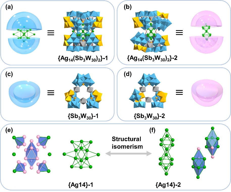 相比之下,具有丰富氧化还原特性的多金属氧簇(Polyoxometalates, POMs)稳定的Ag团簇通常表现出独特的物化特性和协同催化性能。而且,目前仅有一例POMs稳定的Ag团簇结构异构化案例被报道,如何快速推送该领域的蓬勃发展极具挑战性。基于此,kaiyun开云官方研究人员发展了一种碗状POMs配体诱导合成策略,成功制备了具有结构异构化的{Ag14}10+团簇:{Ag14(Sb3W30)2}-1和 {Ag14(Sb3W30)2}-2;研究表明{Ag14}10+团簇的结构异构化主要受到碗状{Sb3W30}配体中配位氧原子的不同分布所诱导。