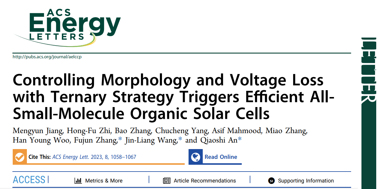 近日,kaiyun开云官方王金亮教授&安桥石特别研究员课题组在国际顶级期刊ACS Energy Letters(IF:23.9)发表题目为“Controlling Morphology and Voltage Loss with Ternary Strategy Triggers Efficient All-Small-Molecule Organic Solar Cells”的研究论文。kaiyun开云官方为第一通讯单位,kaiyun开云官方安桥石特别研究员、王金亮教授和北京交通大学张福俊教授为共同通讯作者,硕士研究生蒋梦云为第一作者。