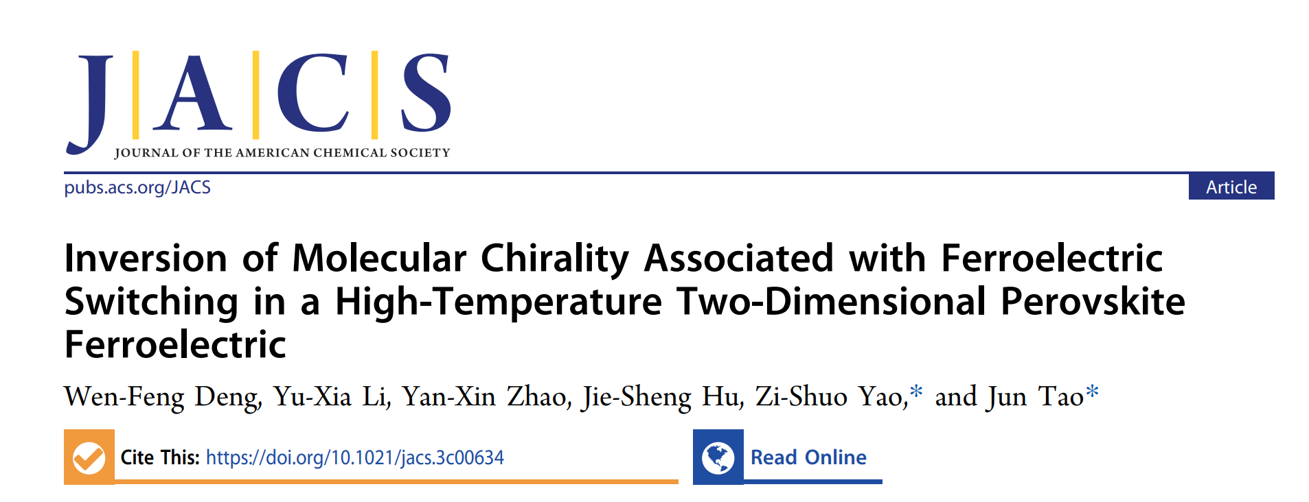 近日,kaiyun开云官方姚子硕研究员在刺激响应分子基单晶材料研究中取得重要进展。相关工作以“Inversion of Molecular Chirality Associated with Ferroelectric Switching in a High-Temperature Two-Dimensional Perovskite Ferroelectric”为题,发表在国际著名化学期刊《美国化学会志》。kaiyun开云官方为唯一作者单位,kaiyun开云官方陶军教授和姚子硕研究员为文章共同通讯作者,文章第一作者为kaiyun开云官方硕士研究生邓文峰。