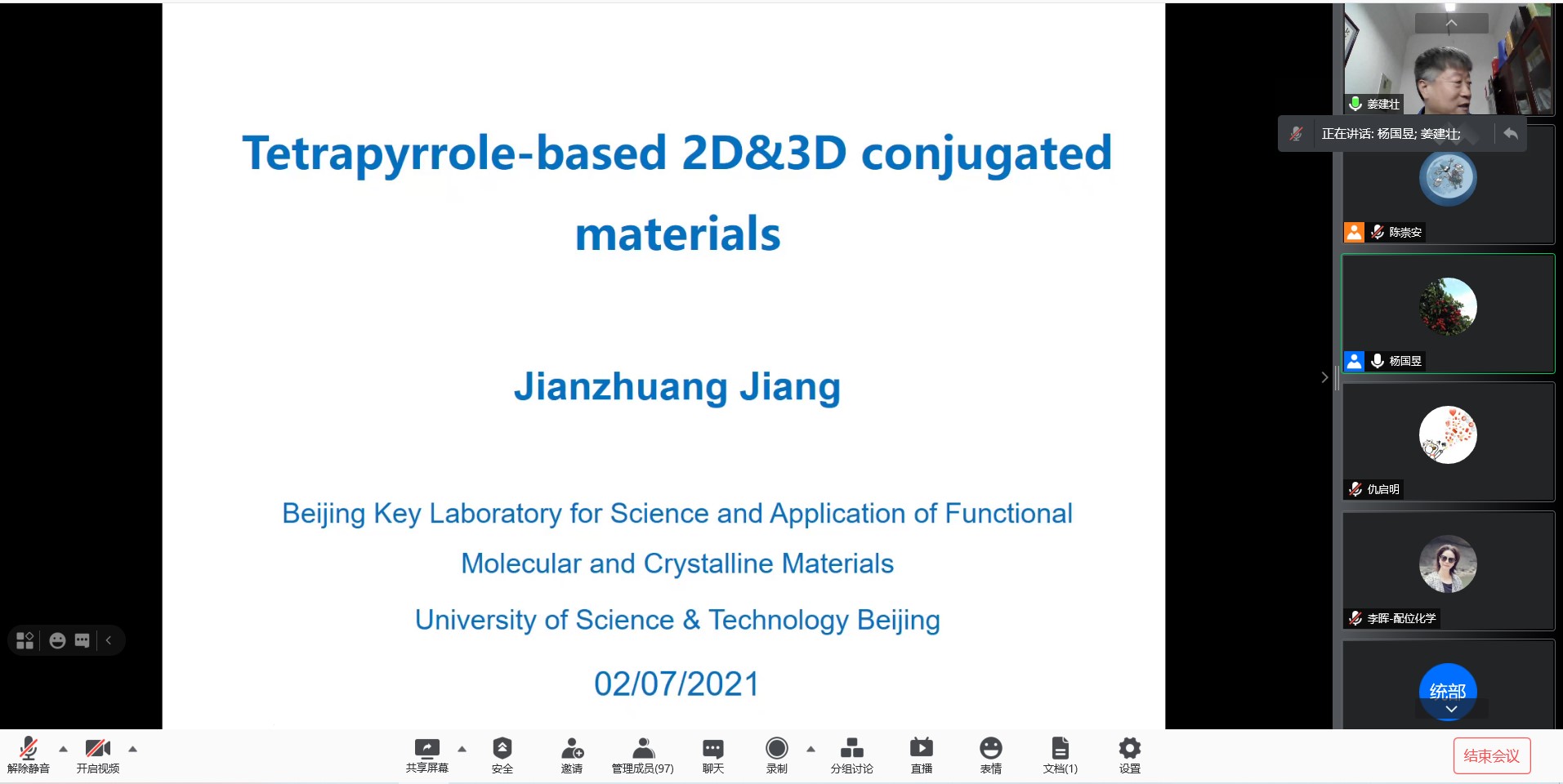 应kaiyun开云官方邀请,北京科技大学姜建壮教授于2021年7月2日9:20做客北理工“百家大讲堂”,为我院广大师生带来题为“Tetrapyrrole-based 2D&3D conjugated materials”的精彩学术报告。本次报告在腾讯会议平台线上进行,由杨国昱老师主持,近百名化院师生参加了报告。