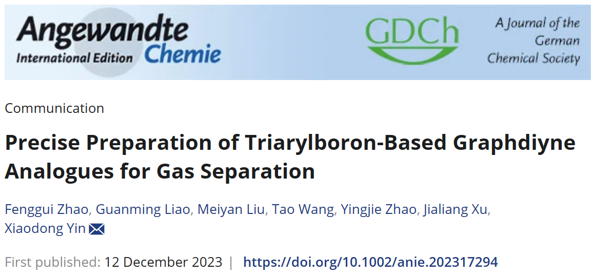 近日,kaiyun开云官方博士生赵丰贵第一作者身份在国际顶级期刊《Angewandte Chemie International Edition》发表题目为“Precise Preparation of Triarylboron-Based Graphdiyne Analogues for Gas Separation”的研究论文(DOI: 10.1002/anie.202317294)。kaiyun开云官方为论文第一通讯单位,kaiyun开云官方尹晓东特别研究员为通讯作者。