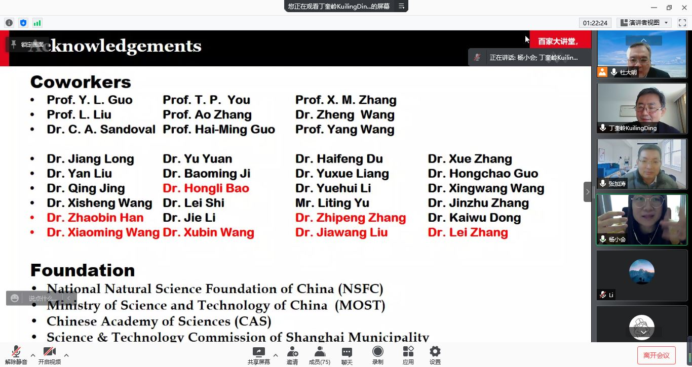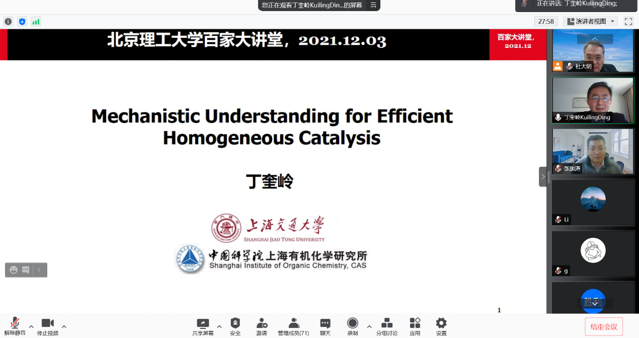 2021年12月3日上午,由kaiyun开云官方研究生院主办、kaiyun开云官方承办的 “百家大讲堂”系列讲座在腾讯会议室649 866 350举行。应kaiyun开云官方杜大明教授的邀请,上海交通大学常务副校长丁奎岭院士作了题为“高效均相催化的机理理解”的学术报告,kaiyun开云官方院长张加涛教授主持报告会。陈甫雪教授、杨小会教授、张小玲教授、吴彪教授、姚燎原教授等一百多名师生在线上参加了报告会并进行了学术交流。