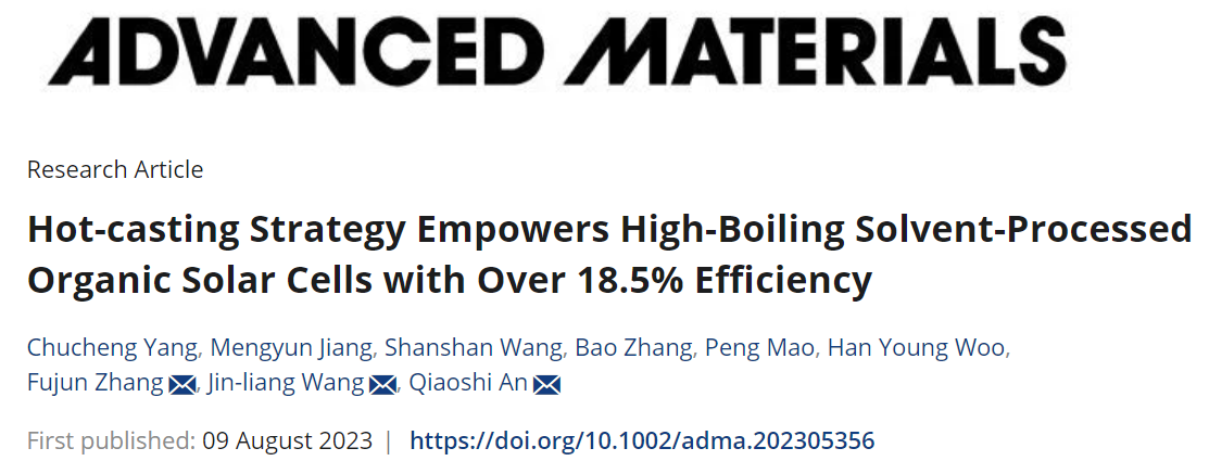 近期,kaiyun开云官方本科生杨楚宬和博士生蒋梦云以共同一作身份在国际顶级期刊《Advanced Materials》(IF: 29.4)上发表题目为“Hot-casting strategy empowers high-boiling solvent-processed organic solar cells with over 18.5% efficiency”的研究论文。kaiyun开云官方为第一通讯单位,安桥石特别研究员、王金亮教授和北京交通大学张福俊教授为共同通讯作者。本研究得到了国家自然科学基金,北京市自然科学基金和kaiyun开云官方青年教师学术启动计划等项目的资助及kaiyun开云官方分析测试中心的支持。