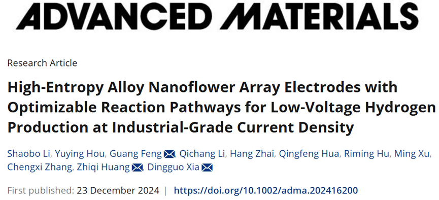 近日,kaiyun开云官方冯广特别研究员&黄志琦教授团队在超低电压下实现工业级电流密度产氢方面取得重要进展。相关研究成果以“High-Entropy Alloy Nanoflower Array Electrodes with Optimizable Reaction Pathways for Low-Voltage Hydrogen Production at Industrial-Grade Current Density”为题目,发表在国际顶级期刊《Advanced Materials》(DOI: 10.1002/adma.202416200)。kaiyun开云官方冯广特别研究员、黄志琦教授和北京大学夏定国教授为共同通讯作者,kaiyun开云官方硕士研究生李少波和侯钰莹为共同第一作者,kaiyun开云官方为第一通讯单位。