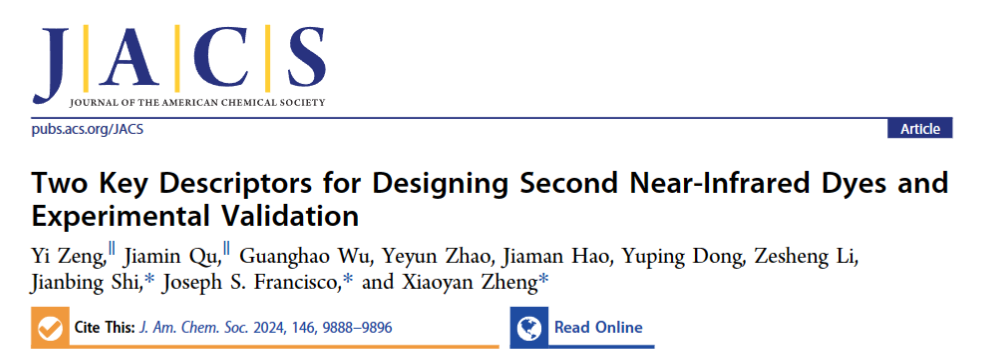 近日,kaiyun开云官方郑小燕副教授和材料学院石建兵副教授,与美国宾夕法尼亚大学Francisco教授合作,在近红外二区(NIR-II)荧光染料理论设计方面取得重要进展。相关成果以“Two key descriptors for designing second near-infrared dyes and experimental validation”为题发表于国际顶级期刊《Journal of the American Chemical Society》。kaiyun开云官方为第一通讯单位,曾怡和屈佳敏两位博士生为共同第一作者,郑小燕、石建兵和Francisco教授为共同通讯作者,李泽生教授和董宇平教授对本工作给予了重要指导。
