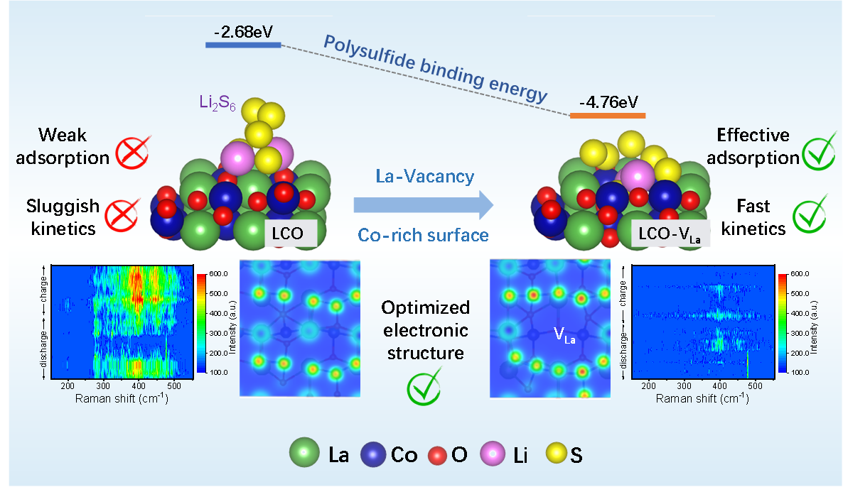 降低成本、提高量密度和延长电池循环寿命对于促进电动汽车的发展至关重要。锂硫电池(LSB)因其优异的能量密度、低成本和环保性而极具前景,有望成为下一代电池的候选。然而,锂硫电池面临多硫化物穿梭和缓慢转化动力学等挑战,阻碍了它们在可再生能源存储和电动汽车中的实际应用。在此,课题组提出了一种使用阳离子空位工程策略合成La缺陷的LaCoO3(LCO-VLa)。在LCO-VLa中引入阳离子空位改变了配位原子的几何结构,使富钴表面具有更多的催化活性表面。同时,LCO-VLa的d带中心向费米能级移动,增强了多硫化物的吸附。此外,电荷补偿诱导的多价钴离子(Co3+/Co4+)增强了LCO-VLa的电导率,加速了电子转移过程并改善了催化性能。理论计算和实验表征表明,La缺陷的LCO-VLa有效抑制了多硫化物穿梭,降低了多硫化物转化的能垒,并加速了氧化还原反应动力学。基于LCO-VLa的电池表现出卓越的倍率性能和循环稳定性,在1.0C下循环近500次后仍保持70%的容量,每次循环的最小衰减率为0.055%。研究成果以“Cation-Vacancy Engineering Modulated Perovskite Oxide for Boosting Electrocatalytic Conversion of Polysulfides”为题,博士研究生白哲为第一作者。
