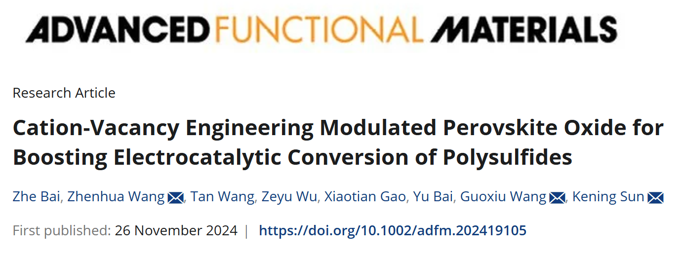 近日,kaiyun开云官方孙克宁教授课题组在锂硫电池钙钛矿氧化物缺陷催化领域取得重要进展,相关成果发表在国际顶级期刊《Advanced Functional Materials》(影响因子18.5),kaiyun开云官方孙克宁教授、王振华教授和悉尼科技大学清洁能源技术中心汪国秀教授为共同通讯作者,kaiyun开云官方为第一通讯单位。