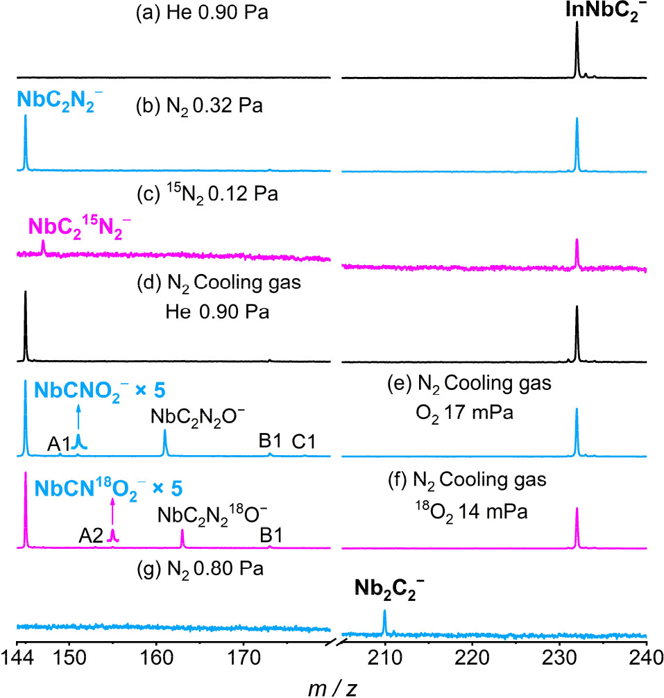 图1. InNbC2−阴离子分别与(a)He、(b)N2、和(c)15N2反应、中间产物Nb(CN)2−阴离子分别与(d)He、(e)O2和(f)18O2反应以及Nb2C2−阴离子与(g)N2反应的飞行时间质谱图。
