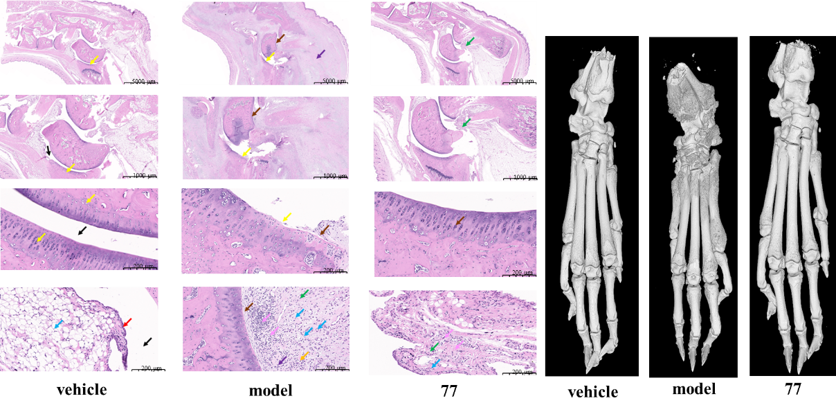 图3 在类风湿性关节炎模型中化合物77DJ-89)的治疗效果(左图:大鼠关节腔切片,右图:大鼠关节CT)