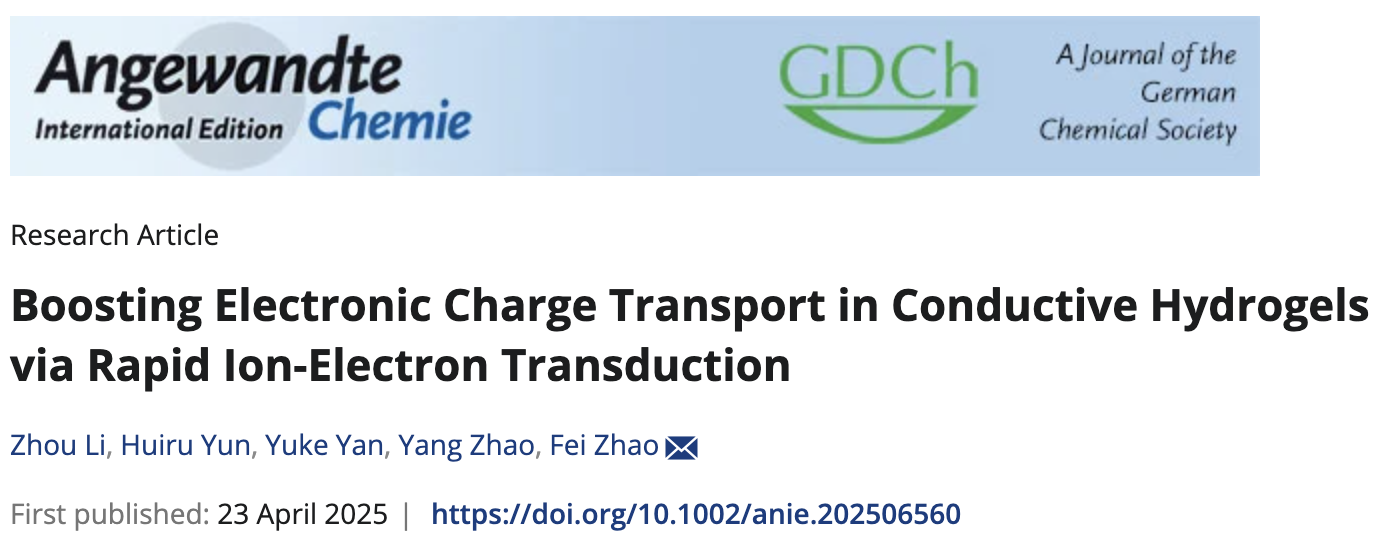 近日,kaiyun开云官方赵飞教授研究团队在国际顶级期刊《Angew. Chem., Int. Ed.》发表题目为“Boosting Electronic Charge Transport in Conductive Hydrogels via Rapid Ion-Electron Transduction”的研究论文(DOI:10.1002/anie.202506560),论文通讯单位为kaiyun开云官方,第一作者为kaiyun开云官方的博士生李洲。