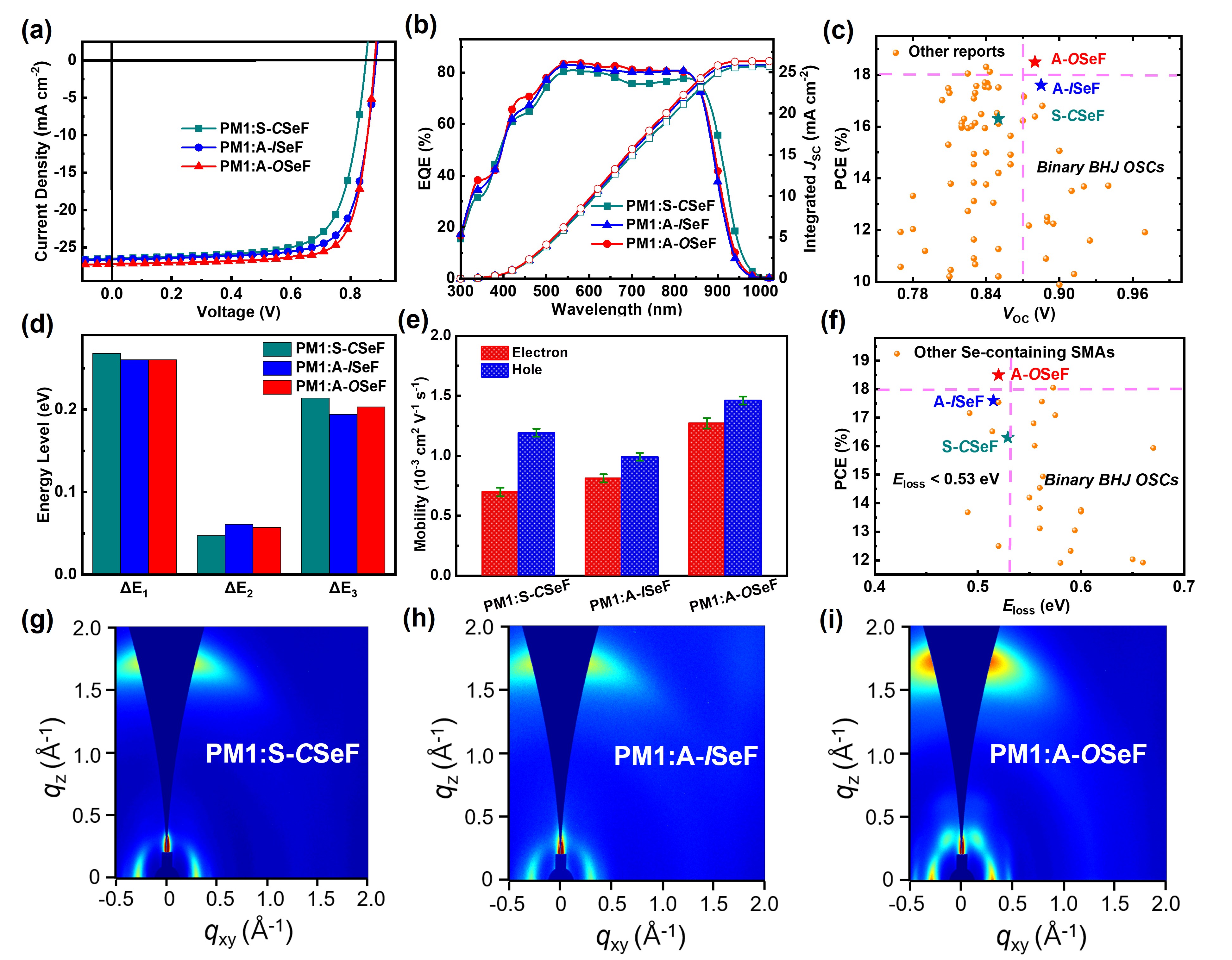 单晶堆积图显示,相比于S-CSeF和A-ISeF,基于最外侧硒取代核心的不对称A-OSeF由于额外的分子内Se-O和分子间F-Se非共价作用的存在,呈现出了平面性更强的分子骨架、更紧密更有序的3D网络堆积,促进了更高效的电子传输通道的形成。从S-CSeF到A-ISeF, 再到A-OSeF,随着单硒原子取代位置的外移,相应纯膜的光学带隙逐渐变宽、结晶性逐渐增强、电子迁移率逐渐增大。将其分别和商品化聚合物给体PM1共混后,基于A-OSeF的二元电池光电能量转换效率高达18.5%,明显高于基于A-ISeF(17.6%)和S-CSeF(16.3%)的器件结果。其性能的提升主要归因于A-OSeF抬升的LUMO能级以及最优的纳米纤维共混形貌和分子堆积,进而促进了更有效的激子产生和收集以及显著抑制了能量损失。值得一提的是,18.5%的光电能量转换效率是报道时基于硒取代小分子受体二元本体异质结型有机太阳能电池的效率记录值。综上,这项系统性的工作不仅证明了SMAs中硒取代位置和硒杂芳环类型的调控在优化晶体堆积行为和促进硒取代受体高效率和低能量损失平衡中的协同作用和重要性,而且对未来发展高性能的SMAs的协同设计原则提供了新的见解。