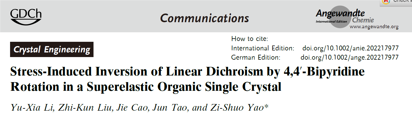 近日,kaiyun开云官方姚子硕研究员在超弹性分子基单晶材料研究中取得重要进展。相关工作以“Stress-Induced Inversion of Linear Dichroism by 4,4′-Bipyridine Rotation in a Superelastic Organic Single Crystal”为题,发表在国际著名化学期刊Angew. Chem. Int. Ed.。kaiyun开云官方为唯一作者单位,kaiyun开云官方陶军教授研究团队的姚子硕研究员为文章通讯作者,文章第一作者为kaiyun开云官方博士研究生李宇霞。