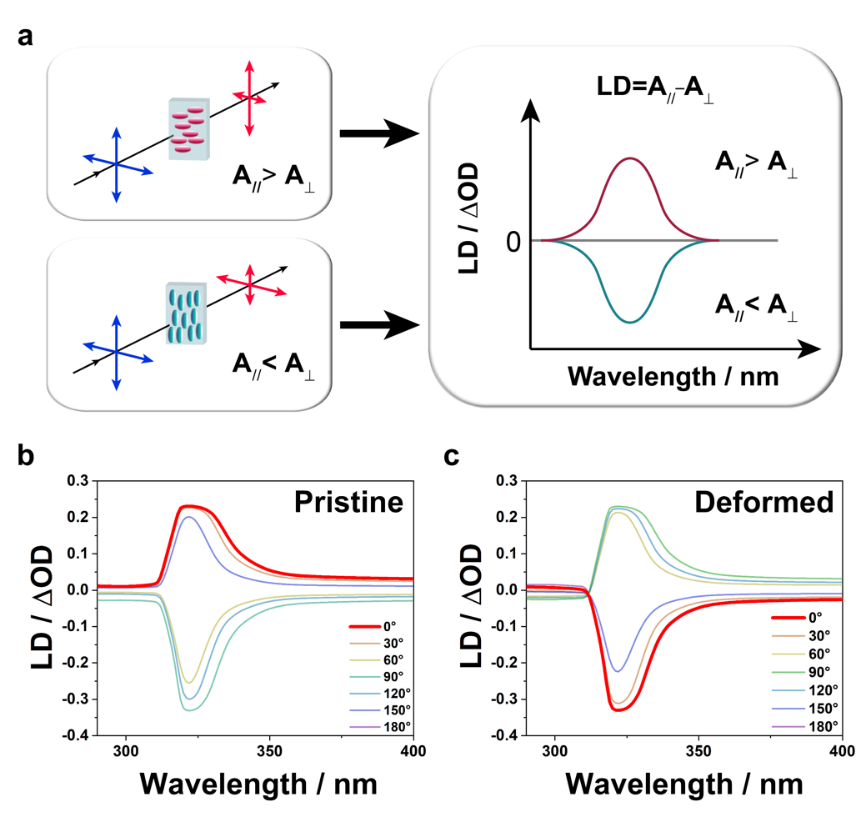 该研究基于压力作用下分子取向变化与超弹性质的结构关联出发,设计合成了新的晶态分子陀螺”— (3,5-二甲基苯甲酸)-(4,4’-联吡啶)-(3,5-二甲基苯甲酸),利用4,4’-联吡啶在剪切力作用下绕氢键轴的90°旋转,实现了单晶的无扩散形变。当撤去外力时,变形晶体迅速恢复初始状态,表现出优异的超弹性能。这种可逆的应力变形具有良好的重复性,经数十次操作,单晶无明显破损。由于4,4’-联吡啶分子平面的90°转动改变了晶格内部跃迁矩的分布,材料线二色性信号在受力状态下发生可逆反转。