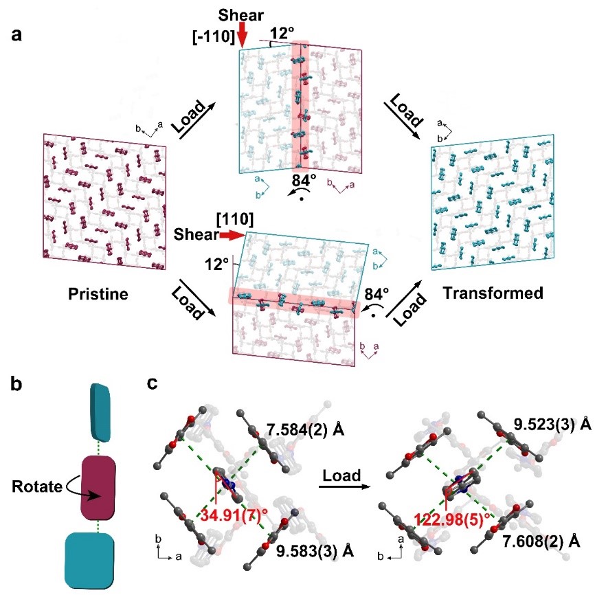 该材料利用晶态“陀螺”受力下的绕轴旋转,实现了单晶材料的超弹形变,并发现了新的力-光耦合作用方式,揭示了晶态分子“陀螺”转动与材料力学性质之间的重要作用,同时力-光性质的耦合有望应用于光学调控及通讯领域。