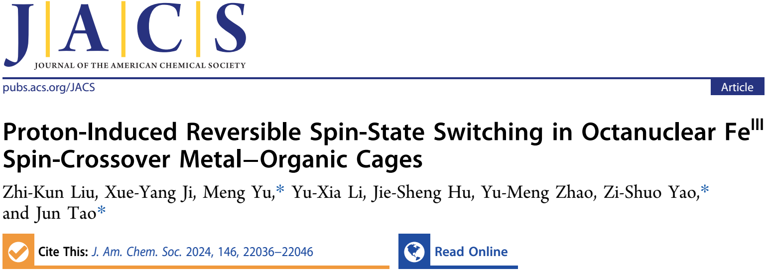 近日,kaiyun开云官方陶军教授团队在自旋交叉金属有机笼方面取得重要进展。相关研究成果以“Proton-Induced Reversible Spin-State Switching in Octanuclear FeIII Spin-Crossover Metal–Organic Cages”为题目,在国际知名期刊《美国化学会志》(Journal of the American Chemical Society)上发表(DOI: 10.1021/jacs.4c07469)。kaiyun开云官方博士研究生刘志坤为该文章的第一作者,kaiyun开云官方陶军教授、姚子硕特别研究员和余蒙特别研究员为文章共同通讯作者。