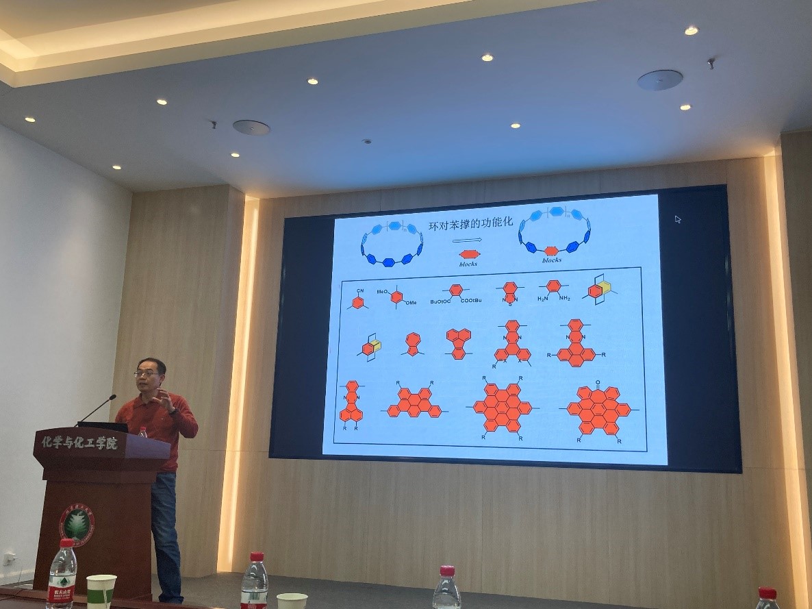 环对苯撑是一类由若干个苯环通过1,4-对位连接而组成的一类有机共轭分子,由于其环状的共轭结构,径向的π-电子体系以及尺寸依赖的物理化学性质和主客体化学性质而受到广泛关注。基于此,江老师首先介绍了通过对环对苯撑结构基元的功能化设计,得到了一系列拓扑结构的大环分子,研究了其光物理性质,发现其荧光强度与苯环数量呈正相关的关系,并对其手性传递、手性稳定性及圆偏振发光的性质进行了探究;其次介绍了大环中功能化基元的区域选择性对拓扑结构的影响以及其拓扑转变;接着又讲述了手性碳纳米环应用于手性三元络合物的分级自组装及其自恋性手性识别;最后又介绍了通过主客体化学将不同发射波长的荧光染料引入到手性大环中,构建了Förster共振能量转移体,实现了可见光区域可调的荧光发光体。
