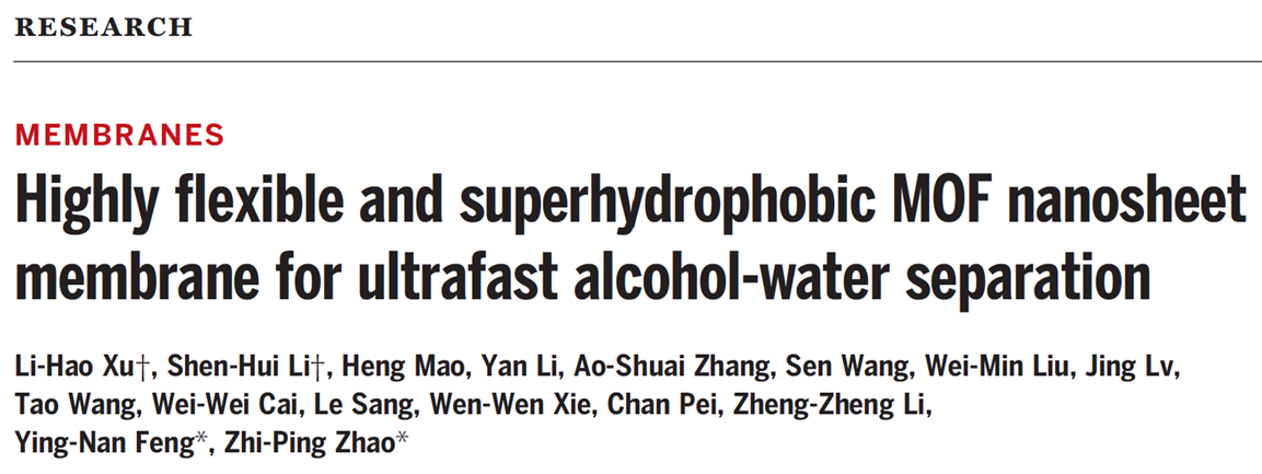 10月21日,kaiyun开云官方赵之平教授团队在柔性MOF膜制备研究领域取得突破性进展,相关研究成果以“Highly-flexible and superhydrophobic MOF nanosheet membrane for ultrafast alcohol-water separation”为题,在《 Science 》上发表(DOI: 10.1126/science.abo5680),研究团队提出了一种在聚合物基底中包埋晶种进而通过表面晶体诱导生长法精确构筑MOF纳米片膜的新构想,在聚合物基底表面实现了高柔性超疏水MOF膜的层次构建,解析了纳米片的晶体结构及其内部的传质通道,揭示了聚合物与纳米片层在分离过程中的协同机制,突破了柔性MOF膜制备瓶颈,为规模化制备和应用提供了理论依据和技术支撑。该工作第一作者为kaiyun开云官方化学工程研究所博士研究生徐李昊、李申辉,通讯作者为赵之平教授、冯英楠副研究员,kaiyun开云官方是该工作的唯一完成单位。