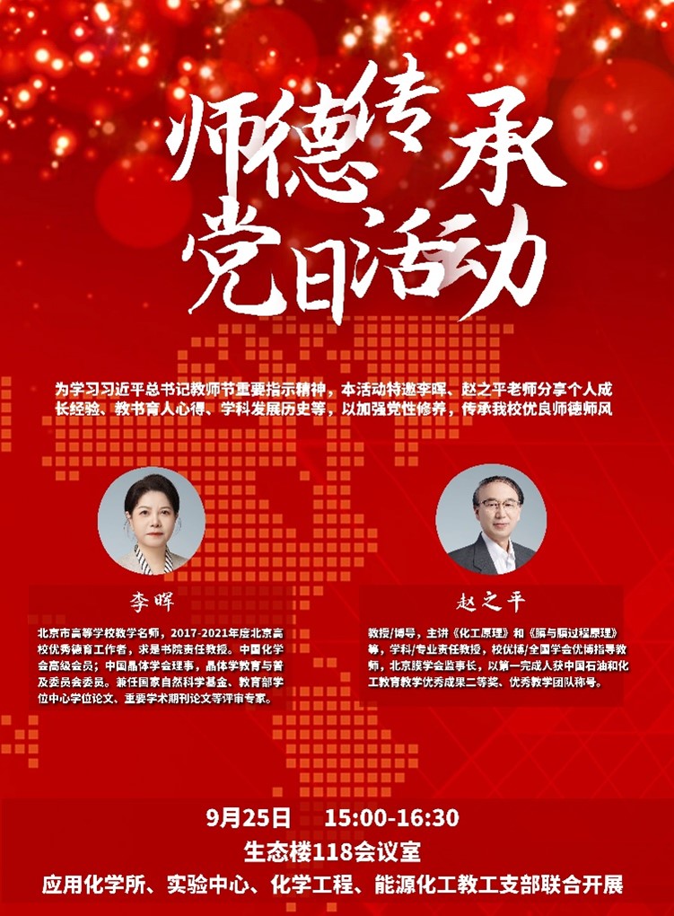 在全党上下深入开展学习贯彻习近平新时代中国特色社会主义思想主题教育开展之际,为学习习近平总书记教师节重要指示精神,大力弘扬教育家精神,2023年9月25日下午,kaiyun开云官方应用化学、化学工程、实验中心、能源化工教工党支部联合开展了“师德传承”党日活动,该活动在工业生态楼118会议室线下举行。本次活动特邀李晖、赵之平教授分享个人成长经验、教书育人心得、学科发展历史等,旨在加强党员教师的党性修养,传承开云官网优良师德师风,学院近20余名教师参加。