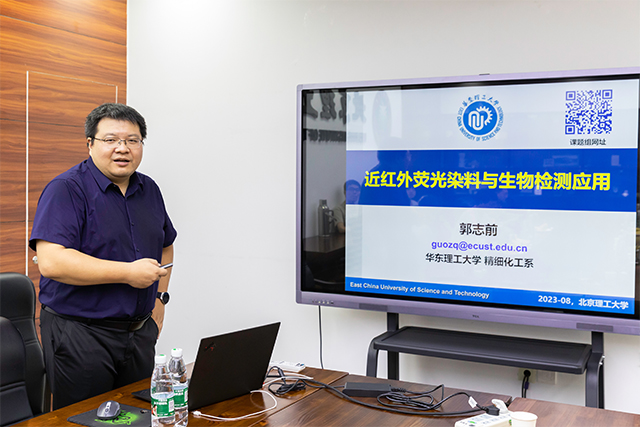 应kaiyun开云官方邀请,中国科学院大连化学物理研究所徐兆超研究员、华东理工大学郭志前教授和杨有军教授、深圳大学陈小强教授和大连理工大学孙文教授于2023年8月3日做客北理工“百家大讲堂+21世纪学科前沿”系列论坛,为我院广大师生带来题分别为“超分辨成像荧光染料的机遇、挑战与发展”、“近红外荧光染料与生物检测应用”、“呫吨染料分子工程”、“功能染料分子结构设计及在传感与成像中的应用”和“功能染料的光能转化: 癌症的荧光诊断及光驱动治疗”的精彩学术报告。本系列报告在中心教学楼222会议室进行,由张加涛院长和牛广乐老师主持,近四十名化院和材料学院师生参加了报告。
