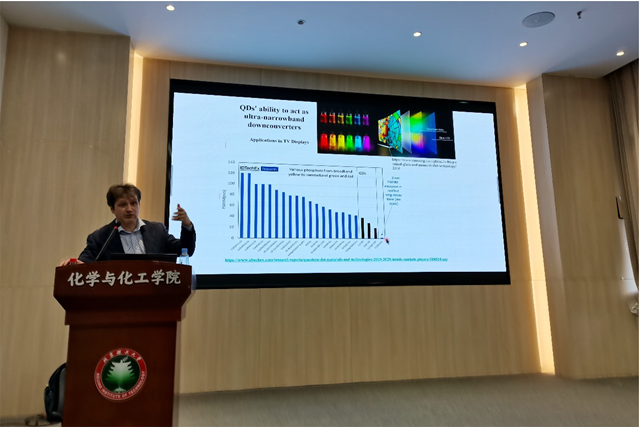 量子点是近年来的热点课题,并于2023年斩获诺奖。Liberato Manna教授从事量子点纳米晶合成多年,以此为背景,Manna教授介绍了量子点纳米晶从发现,到蓬勃发展,再到目前的最前沿的研究进展。从合成纳米晶过程中配体和前驱体的选择,到热注入法和离子交换策略的生长动力学分析,再到量子点在光学器件和传感领域的应用前景,深入浅出的为化院师生进行了量子点相关合成、性质等物理化学知识的科普和拓展,参会师生受益良多,报告在热烈的讨论中结束。