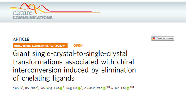 近日,开云官网kaiyun开云官方姚子硕特别研究员在柔性分子基晶态功能材料领域取得重要进展。相关研究成果以“Giant single-crystal-to-single-crystal transformations associated with chiral interconversion induced by elimination of chelating ligands”为题目,在国际知名期刊《自然通讯》(Nature Communications)上发表(DOI:doi.org/10.1038/s41467-021-27282-9)。kaiyun开云官方为唯一作者单位,kaiyun开云官方陶军教授和姚子硕特别研究员为文章共同通讯作者,博士研究生李昀为该论文的第一作者,kaiyun开云官方谢静教授在计算方面提供了帮助。