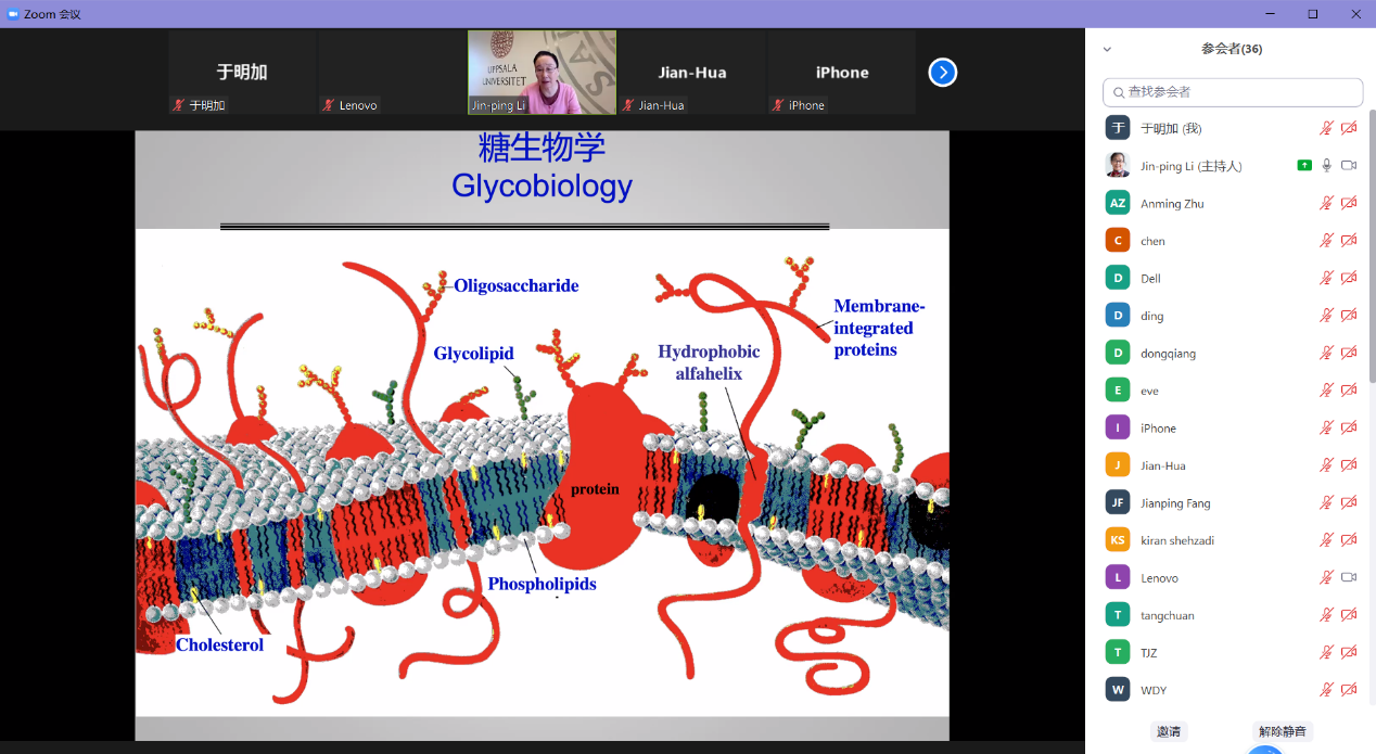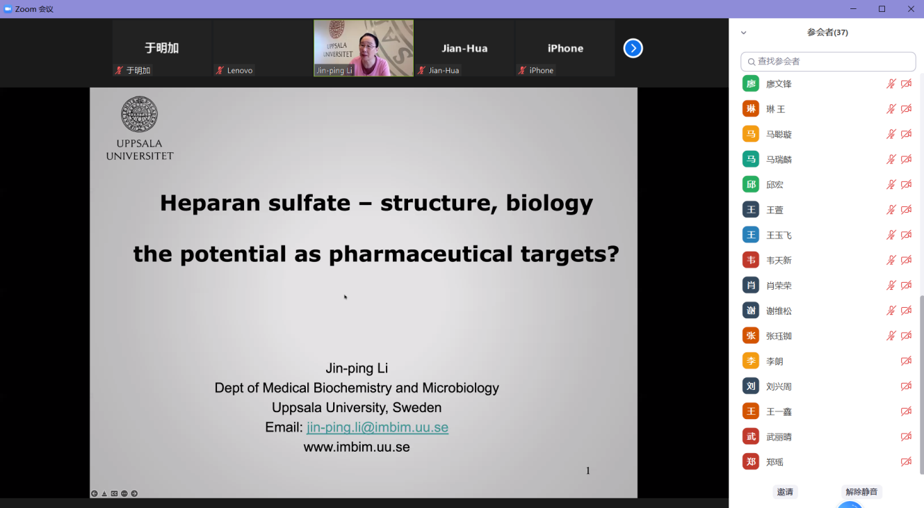 2022年4月25日下午2:30,应kaiyun开云官方梁建华教授邀请,乌普萨拉大学医学院李晋萍教授做客kaiyun开云官方“21世纪学科前沿”系列讲座,为我院广大师生带来题为“Heparan sulfate- structure, biology the potential as pharmaceutical targets”的精彩学术报告。本次报告以Zoom会议线上的方式进行,由于明加特别副研究员主持,学院师生共40余人参加。