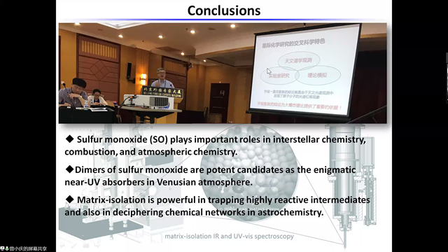 曾小庆教授首先介绍了宇宙中可能存在的一些分子离子、以及研究其在宇宙中的化学转化对生命起源的意义,并指出一些可以探测其存在的科学手段。随后以金星大气层为例,对探测器探测光谱进行分析,推测出一种SO分子可能存在于金星大气层中,并扮演着重要的角色。进一步地,曾小庆教授详细讲述了其研究硫氧分子的过程,包括如何得到较难存在于温和条件的OSSO、能观测到何种异构体、使用何种谱学方法等等。