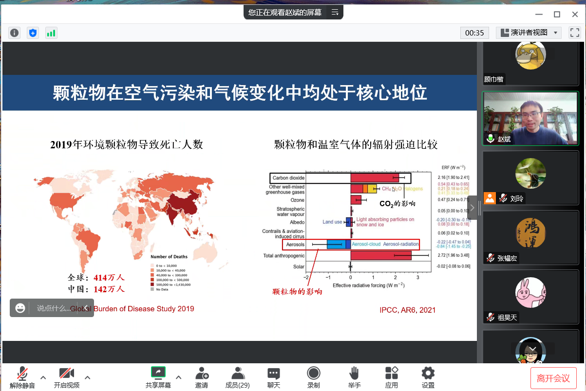 2022年11月15日下午,由kaiyun开云官方研究生院主办,kaiyun开云官方承办的北理工“21世纪学科前沿”系列讲座在腾讯会议线上举行。应kaiyun开云官方张秀辉教授的邀请,清华大学的助理教授赵斌做了题为“区域和全球新粒子生成及其对云凝结核影响的数值模拟研究”的学术报告。近三十名师生参加了讲座并进行学术交流。