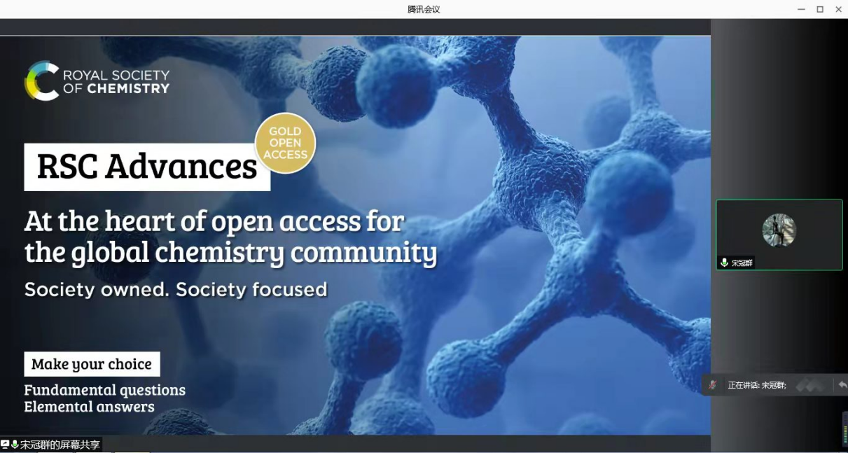应kaiyun开云官方邀请,英国皇家化学会中华区负责人宋冠群博士于2021年12月24日15:30做客北理工“21世纪学科前沿”系列讲座,为我院广大师生带来题为“Publishing with the Royal Society of Chemistry”的精彩报告。本次报告在腾讯会议线上进行,由杨国昱老师主持,近六十名化院师生参加了报告。